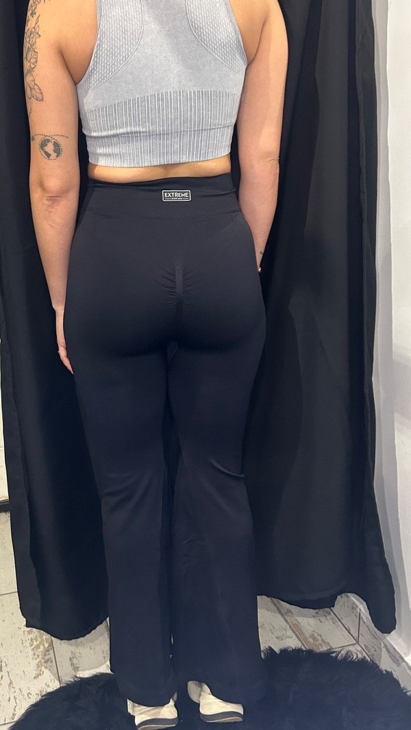 Calza de tela gruesa con cintura cruzada y corte ancho.